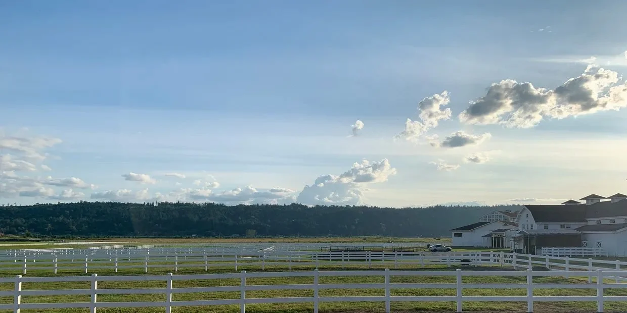 A rural landscape with white fences, green grass, and a large white building under a partly cloudy sky.